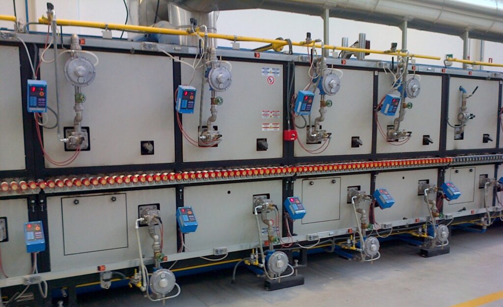 the maximum efficiency was obtained, and it is still obtained for those who still use it in their roller kilns, the “AUTOMATIC ADJUSTMENT SYSTEM”.This system made with modulating valves for gas and for air specifically built by CARFER FORNI.